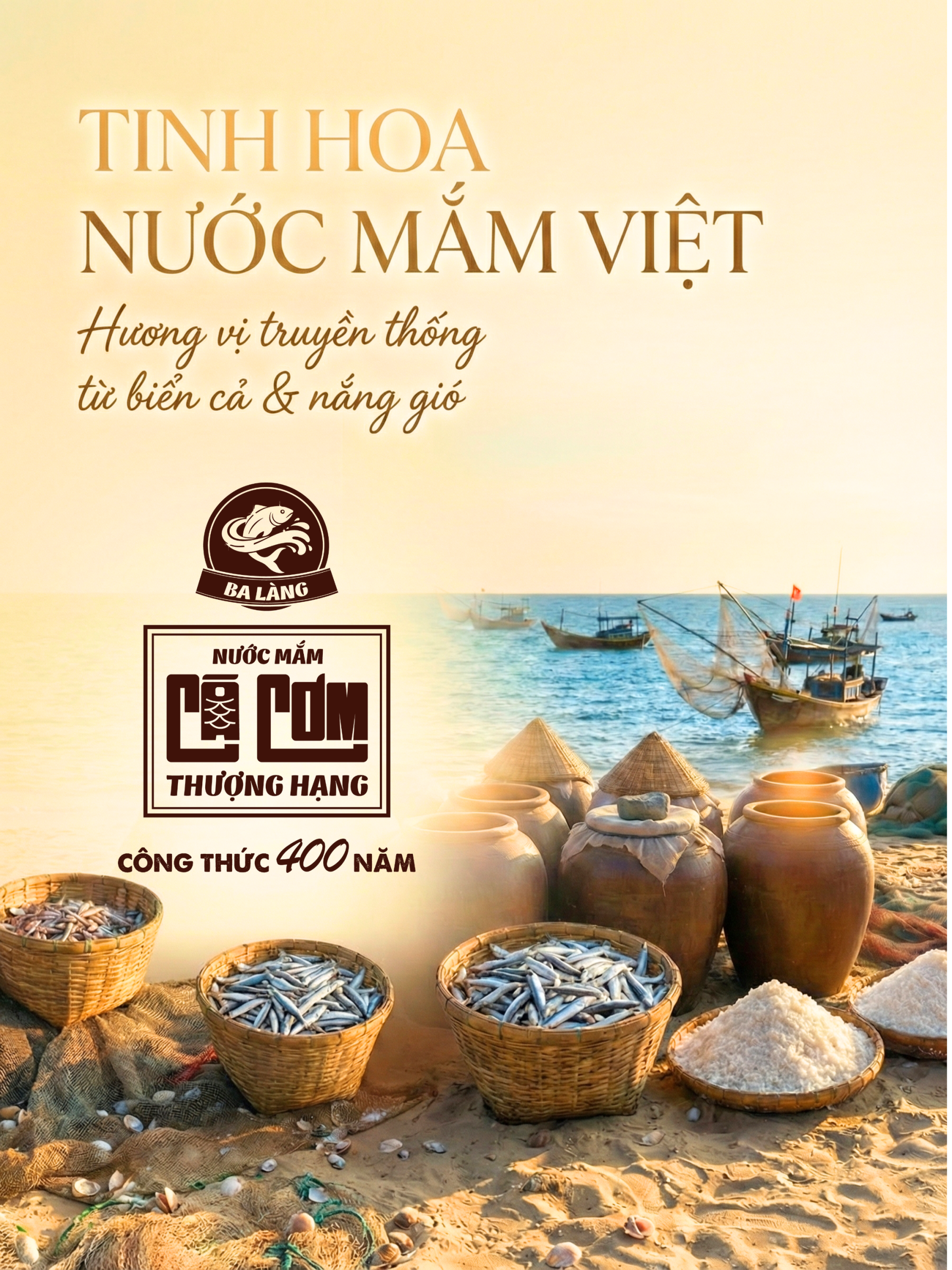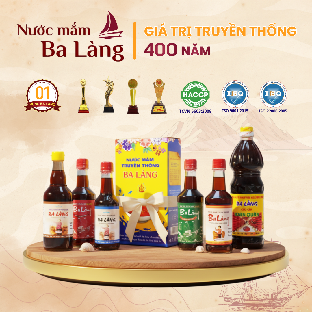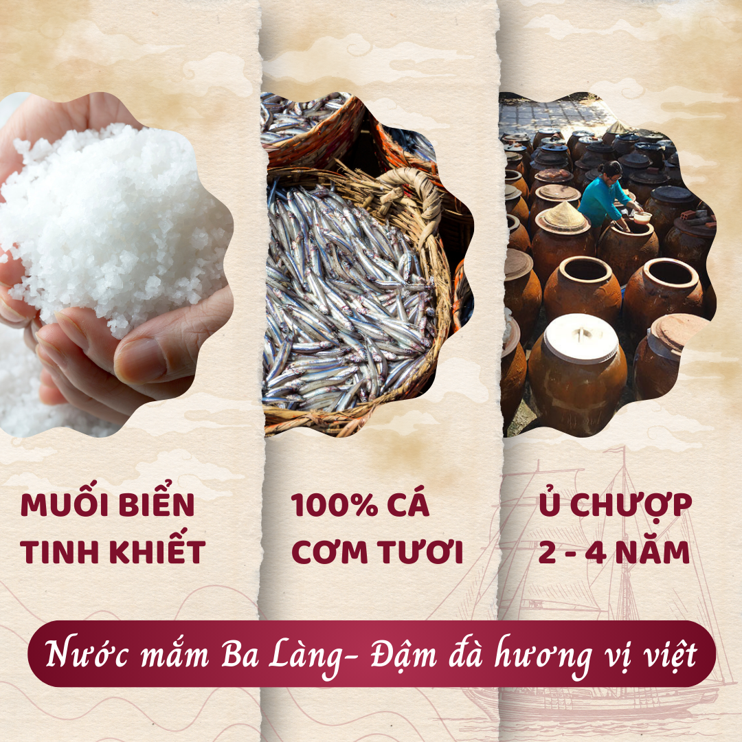 – Nước mắm truyền thống Ba Làng nguyên chất từ cá cơm tươi và muối sạch sử dụng phương pháp muối chượp truyền thống